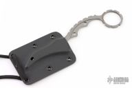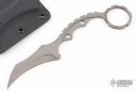 This DMaX V Fighter from Max Venom was designed by edge weapons expert Doug Marcaida. The knife features one-piece construction with a bead blast finish hawkbill style blade with grooved handle and finger hole on pommel. Includes kydex sheath. Has some sheath scuffs, otherwise excellent condition.