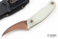This Elvia by Turner CNC features an "HT" finished hawkbill blade, .153" blade stock and 1.075" blade depth with full tang construction. The handle has a milled jade g10 scales with bronzed hardware.  Comes with a kydex sheath and the knife will fit in either direction, original box, and COA. 63HRC. Excellent condition.