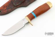 This hunter by D Alexander features a mirror polished blade with .193" blade stock and .989" blade depth, hidden tang construction. The handle has a brass guard with red/turquoise spacers, wood grip and brass buttcap. Comes with a hand tooled brown leather sheath. Has some light scratches and patina, otherwise excellent condition.