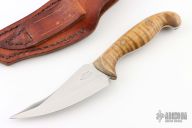 This skinner by Jim Serven features a mirror polished upswept blade with a full tang construction. .126" blade stock and, 1.413" blade depth.  The handle has pinned wood slabs.  Includes a brown leather sheath. Has some light scuffs and scratches, great condition otherwise.