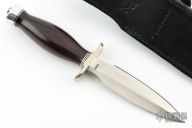 This dagger from Martin Knives features a satin finished double edge blade with .222" blade stock and 1.109" blade depth, hidden tang construction. The handle has a nickel silver guard, aluminum butt, maroon linen micarta commando style handle with black and aluminum spacers. Comes with a black leather sheath. Excellent condition. Dated 07