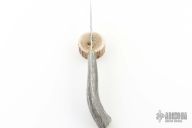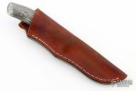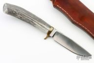 This hunter by Recatto Custom Knives features a satin finished blade with fileworked blade spine, .149" blade stock and .992" blade depth, hidden tang construction. The handle has brass guard, axis deer antler grip. Comes with a brown leather sheath. Excellent condition.