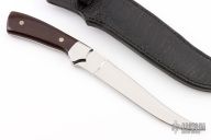 This Fighter by Don Howland features a mirror polished blade with sharpened top edge, .116" blade stock and 1.033" blade depth, full tang construction. The handle has dovetailed stainless steel bolsters with cocobolo scales and mosaic pins. Comes with a black leather sheath. Has some light scratches, otherwise excellent condition.