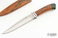 This Hunter from David Brodziak features a two-tone clip point blade with satin flats, polished grinds, and false top edge. The handle is comprised of a polished nickel silver guard with nickel silver and black fiber spacers and wood handle over hidden tang construction. Includes leather matching wood sheath. Some sheath marks on blade, excellent condition otherwise.