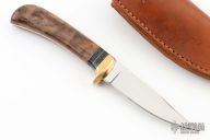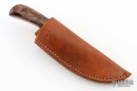 This custom skinner by RSB Custom Knives features a mirror polished clip point blade with .136" blade stock and .841" blade depth, full tang construction. The handle has a brass guard, corian spacers, and wood grip. Comes with a brown leather sheath. Has a couple light scuffs and scratches, excellent condition otherwise.