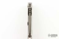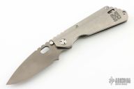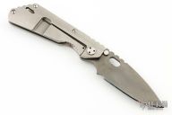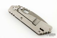This PT CC by Mick Strider features a Chromium Nitride finished blade with notched thumbrest, dual thumbstuds and thumbhole. The handle is tumble finished titanium with a lanyard hole. Nice detent, lockup and blade seating. Comes with a zipper case. Has scuffs and scratches, has been resharpened, great user condition.