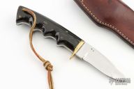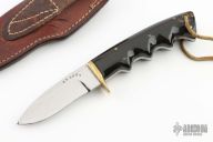This Drop Point Hunter by Enedino De Leon features a satin finished blade with a notched thumbrest, .187" blade stock and 1.018" blade depth, full tang construction. The handle has a brass guard and pins, buffalo horn scales. Comes with a brown leather sheath. Has some light scratches, otherwise excellent condition.