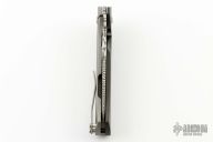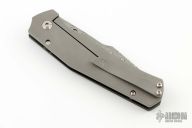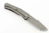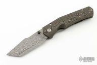 This Vector from Bradley Marais features a Damasteel clip point tanto blade with single zirconium thumb stud and notched thumbrest. The handle is comprised of carbon fiber, titanium lock side, barrel spacers, and titanium tip up pocket clip. Comes with zipper case, and alternate copper thumbstud. Excellent condition.