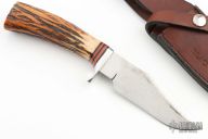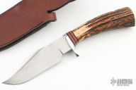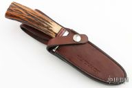 This Classic Blades Trail Guide from Blackjack Knives features a satin finish clip point blade with false top edge, .209" blade stock and 1.397" blade depth, hidden tang construction. The handle has an aluminum guard, red and black spacers, stag grip. Includes original leather sheath. Has some light scratches and oxidation spots, otherwise good condition.