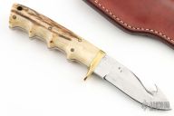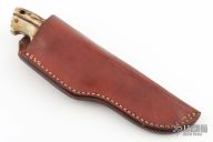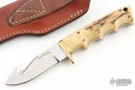 This Drop Point Hunter by Enedino De Leon features a satin finished blade with a notched thumbrest and guthook, .178" blade stock and 1.034" blade depth, full tang construction. The handle has a brass guard and pins, stag scales with red liners. Comes with a brown leather sheath. Has some light patina, otherwise excellent condition.