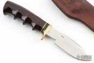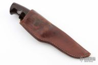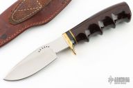 This Hunter by Enedino De Leon features a satin finish blade with a false top edge and notched thumbrest, .188" blade stock and 1.285" blade depth, hidden tang construction. The handle has a brass guard, rosewood grip with black/brass spacers. Includes a brown leather sheath. Has some light scratches, otherwise excellent condition.