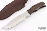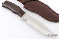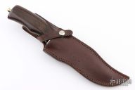 This knife from Colt features mirror polished blade with integral guard, .350" blade stock and 1.674" blade depth, hidden tang construction. The handle has a dymondwood grip with a tang nut with lanyard hole. Comes with a brown leather sheath. Has some scratches and small oxdation/patina spots, otherwise good condition.