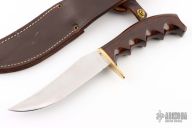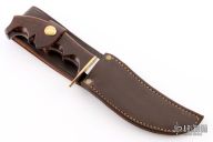 This knife features a satin finished blade with .159" blade stock and 1.218" blade depth, hidden tang construction. The handle has a brass guard, and a rosewood grip with finger grooves. Comes with a brown leather sheath. Has a few light scratches and a couple small dings in the blade, otherwise good condition.