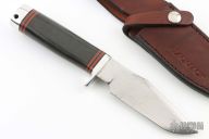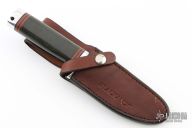 This Classic Blades Trail Guide from Blackjack Knives features a satin finish clip point blade with false top edge, .210" blade stock and 1.401" blade depth, hidden tang construction. The handle has an aluminum guard and butt, red and black spacers, black canvas micarta grip. Includes original leather sheath. Has some light scratches and oxidation spots, otherwise good condition.