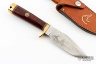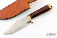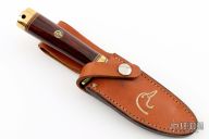 This Classic Blades Trail Guide from Blackjack Knives features a satin finish clip point blade with false top edge, .210" blade stock and 1.350" blade depth, hidden tang construction. The handle has a brass guard and butt, red white and black spacers, dymondwood grip. Includes original leather sheath. Has scratches and oxidation spots, otherwise good condition.