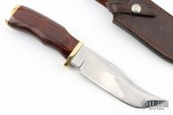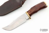 This knife from Colt features mirror polished blade with false top edge, .339" blade stock and 1.620" blade depth, hidden tang construction. The handle has a brass guard and butt, dymondwood grip. Comes with a brown leather sheath. Has some scratches and small oxdation/patina spots, otherwise good condition.