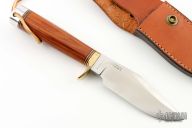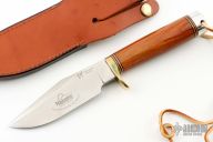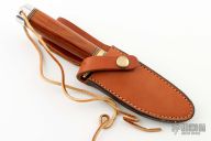 This Classic Blades Trail Guide from Blackjack Knives features a satin finish clip point blade with false top edge, .214" blade stock and 1.362" blade depth, hidden tang construction. The handle has a brass guard and aluminum butt, red white and black spacers, dymondwood grip. Includes original leather sheath. Excellent condition.