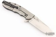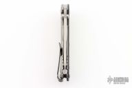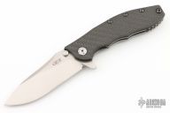 This Hinderer Designed 0562 Framelock Flipper has a drop/ spear point blade with swedge, notched thumb rest, dual thumb studs and flipper. Handle is carbon fiber and anodized and stonewashed titanium - with stainless steel lockbar insert and a carbon fiber lockbar stabilizer. Has copper pivot and insert screw. Stainless steel clip is tip up. Has a couple light scuffs, excellent condition otherwise. #2950