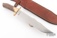 This Limited Edition Utility Bowie by Gerber features a satin finished blade with sharpened top edge, .303" blade stock and 1.509" blade depth, hidden tang construction. The handle has a brass guard and stag grip. Comes with a brown leather sheath. Has a few light oxidation spots, otherwise excellent condition.