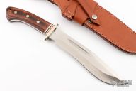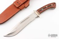 This Grizzly Bowie by Tak Blades features a satin finished, recurved bowie style blade with swedge and fullers, .257" blade stock and 1.772" blade depth, hidden/frame tang construction. The handle has a nickel silver guard with nickel silver and red and black fiber spacers, dymondwood scales with Grizzly Paw shield and nickel silver pins over full tang construction. Brass lanyard tube in pommel. Includes leather sheath with belt loop. Has a couple light scratches, otherwise excellent condition.