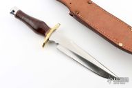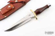This Fighter by John Carson features a clip point satin finished blade with sharpened top edge, .207" blade stock and 1.434" blade depth, hidden tang construction. The handle has a brass guard and aluminum butt with a stacked leather grip and red/blue/white spacers. Comes with a brown leather sheath. Has some light scratches, otherwise excellent condition.