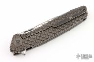 This limited 604DS model has a bronze titanium handle and a Vinland Damasteel drop point blade. The We Knife Co. 604D offers a long elegant design with a sleek blade and a scale textured titanium handle that provides a utilitarian grip as well as a collectible appearance. Dark bronze hardware adds a nice finishing touch to the design.