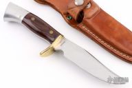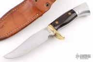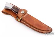 This knife by Westmark features a satin finished blade with false top edge, .171" blade stock and 1.212" blade depth, 3/4 full tang construction. The handle has a brass guard and pins, aluminum butt cap, dymondwood scales. Comes with a brown leather sheath. Has been used and resharpened, has some scratches, otherwise good user condition. #30552