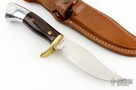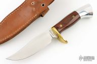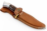 This knife by Westmark features a satin finished blade with false top edge, .171" blade stock and 1.212" blade depth, 3/4 full tang construction. The handle has a brass guard and pins, aluminum butt cap, dymondwood scales. Comes with a brown leather sheath. Has a couple light scratches, otherwise excellent condition. #40054