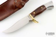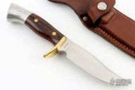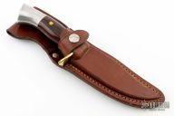 This knife by Westmark features a satin finished blade with false top edge, .171" blade stock and 1.212" blade depth, 3/4 full tang construction. The handle has a brass guard and pins, aluminum butt cap, dymondwood scales. Comes with a brown leather sheath. Has a couple light scratches, otherwise excellent condition. #06324