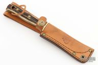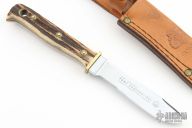 This Hunter's Pal by Puma Knives features a satin finished blade with notched spine and false top edge, partial serrations, .2" blade stock and .793" blade depth, full tang construction. The handle has a brass guard with stag scales. Includes original leather sheath. #39382 on the guard. Has scuffs, scratches, and patina. Great condition for it's age.