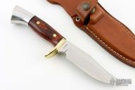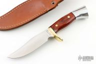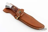 This knife by Westmark features a satin finished blade with false top edge, .171" blade stock and 1.212" blade depth, 3/4 full tang construction. The handle has a brass guard and pins, aluminum butt cap, dymondwood scales. Comes with a brown leather sheath. Has a coupel light scratches, otherwise excellent condition. #38049