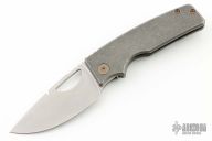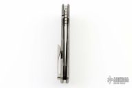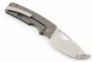 This knife by the OZ Machine Company features a tumbled Magnacut blade with thumbhole and notched thumbrest. The handle features a smooth blast and tumble finish titanium frame with an anodized titanium backspacer and tip up clip with hidden screws. Includes box and papers dated 12-12-23 and s/n 2698. Also includes extra hardware and bearings. Excellent condition.