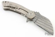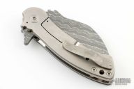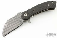 This knife by Grindhouse Knives features a Chad Nichols Iguana pattern Damascus wharncliffe blade with notched thumbrest and flipper. The handle has a carbon fiber scale, satin finished titanium frame with "unobtanium" tip up clip, and lanyard hole at the butt. Comes with soft pouch, COA, and box. Nice detent, lockup and blade seating. Has a few light scratches on the frame, otherwise excellent condition.