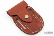 Lile Leather Pancake Sheath for a folder that is roughly 5" closed for a Lile button lock folder. This one has "Col Mark A. Miles USA (RET)" and "D-2" written on the back.