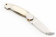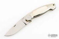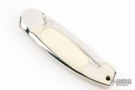 This Button Lock Folder from Jimmy Lile features a satin finished blade with nail nick, #129 on blade. The handle has a nickel silver frame with mammoth ivory inlays. Large button lock release mechanism used to open and close the knife. Numbered "94" on inside of backspacer. Has some a couple light scratches, otherwise excellent condition.