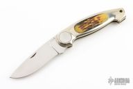 This Button Lock Folder from Jimmy Lile features a satin finished blade with nail nick, #086S on blade. The handle has a nickel silver frame with stag inlays. Large button lock release mechanism used to open and close the knife. Numbered "83" on inside of backspacer. Has some scratches, otherwise good condition.
