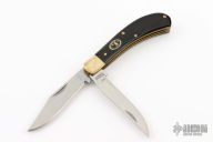 This trapper by EC Simmons Hardware Co features two polished blades with nail nicks. The handle has nickel silver bolsters, buffalo horn scales, brass liners and stainless steel springs. Has half-stops. Comes with original box. Has a few light scratches, otherwise excellent condition.