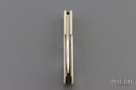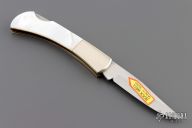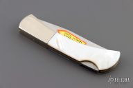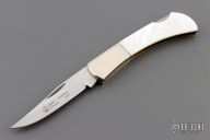 This Puma Gent lockback features a satin finished blade with a nail nick. The handle has nickel silver bolsters, mother of pearl scales, brass liners and a stainless steel backspacer.  Includes the original box. Has a few light scratches, otherwise excellent condition.