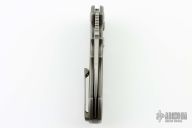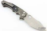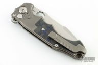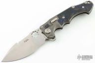 The Alpha folding knife from Andre de Villiers is a masterwork combining functionality and personality. This one has a matte finished blade with thumbhole, notched thumbrest and flipper. It swings smoothly on a ball-bearing system and has both a thumb hole and flipper opener; it can also be opened or closed with a flick of the wrist when the carbon fiber-inlaid button lock is held down. A safety switch on the side allows the blade to be locked in the closed position or provides an additional level of safety in the open position. It has a milled titanium handle in a black finish with marble carbon fiber inlays that offers an extremely comfortable grip. A jimped, black titanium backstrap with a lanyard hole and a tip-up, black, titanium pocket clip with hidden screws. Comes with a zippered case. "72-2020" on the ricasso. Excellent condition.