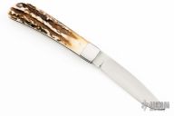This slipjoint by J.H. Lloyd features a hand rub satin finished blade with a nail nick.  The handle has stainless steel bolsters, stag covers, stainelss steel liners and backspacer. The half-stop is flush in all positions. Has some light scratches, otherwise excellent condition.