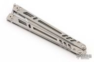 This Barebones Balisong by Blade Runner Systems features an upswept stonewashed blade. The handle is comprised of tumble finished machined steel construction with a matching "T" latch. Comes with original box and papers. Has a few light scuffs, excellent condition otherwise.