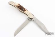 This trapper by Horace Kelley is stamped 2 24 86, which may be a date stamp. The blades are satin finished with nail nicks. The handle has nickel silver bolsters, stag scales, nickel silver liners, stainless steel springs. Has some light scratches, otherwise good condition.