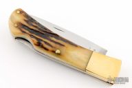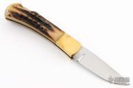 This lockback by Keith Blalock features a mirror polished blade with nail nick. The handle has dovetailed brass bolsters, stag scales, brass liners, stainless steel backspacer. Has a couple light scratches, otherwise excellent condition.
