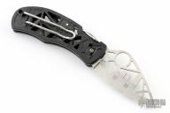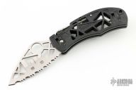 This Q Knife front-lock folder by Spyderco has a skeletonized satin finished stainless steel fully serrated blade with unique, clip-style front lock. Handle is gray skeletonized polymer with 4-way reversible clip and lanyard hole. Excellent condition. Comes with original box.