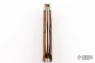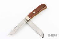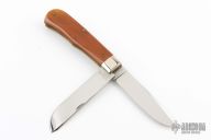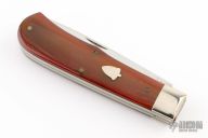 This Pioneer Trapper by Great Eastern Cutlery features polished blades with nail nicks. The handle has nickel silver pinched bolsters, red buffalo horn covers with a nickel silver escutcheon, brass liners/pins, stainless steel springs. Has half stops. Comes with original tube. Has a couple light scratches, otherwise excellent condition.