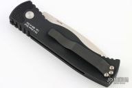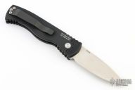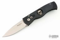 This TR-2 has a satin finished blade and a black aluminum handle inlaid with a sterling silver skull designed by Bruce Shaw. Mother of Pearl button inlay and a black stainless steel clip. Serial number 66 of 200. Comes with original box, sheath and papers. Excellent condition.
