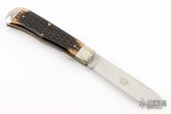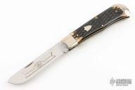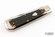 This Linerlock by Great Eastern Cutlery features a polished blade with nail nick. The handle has nickel silver bolsters, black jigged bone covers with nickel silver escutcheon, brass liners, stainless steel locking liner, and stainless steel spring. Comes with original tube and COA dated Sept 30, 2009. Excellent condition. #28 of 50
