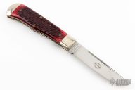 This Linerlock by Great Eastern Cutlery features a polished blade with nail nick. The handle has nickel silver bolsters, black plum jigged bone covers with nickel silver escutcheon, brass liners, stainless steel locking liner, and stainless steel spring. Comes with original tube and COA dated Sept 30, 2009. Excellent condition. #09 of 50