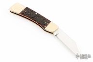 This knife features a mirror polished clip point blade with a single nail nick. The handle features nickel silver bolsters, brass liners and jigged bone scales. Includes a brown leather sheath. Excellent Condition. #2177