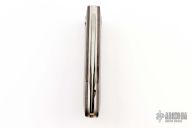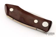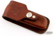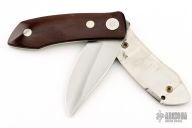 This Barry Wood design swing lock folder features a satin finish blade and satin finish stainless steel frame with maroon linen micarta scales. This is a very unique scissor opening folder, which when the blade is fully open and locked in place is almost a fixed blade knife. The handle is nicely contoured for a comfortable grip. Opening is accomplished by lighting pressing down and outward at the rear indentation on the spine, which releases the locking pin and allows one side of the handle and the blade to rotate down then forward until the blade locks in the forward position. The one side of the handle continues to rotate back until it locks in place. Closing requires the same slight thumb pressure at the indentation to release the locking pin, then the one side of the handle is rotated back and around, catching the blade and aligning both with the other side of the handle in a locked closed position.  Comes with a leather Colt belt sheath. Has some scuffs and scratches, otherwise good condition.